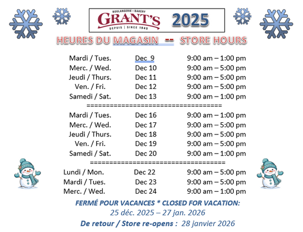 Nos heures d'ouverture pour notre magasin durant le temp des fêtes (2025) / Our store hours for this holiday season (2025) ....